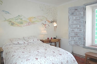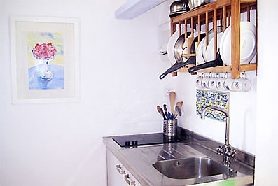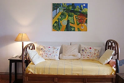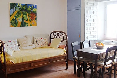 The accommodation is all on one floor and consists of a neat open-plan living/dining room and a mini-kitchen with a 2 ringed ceramic hob, microwave, and refrigerator. Simple, rustic furniture blends with colourful art pieces created by the owner. The bedrooms consist of one double and a twin. Bathroom with shower, WC, and basin. The house is provided with central heating.