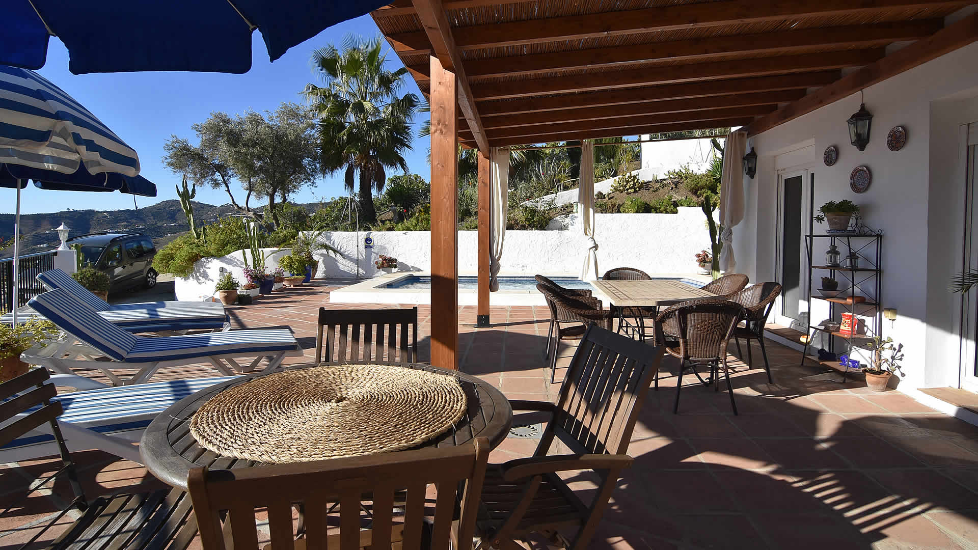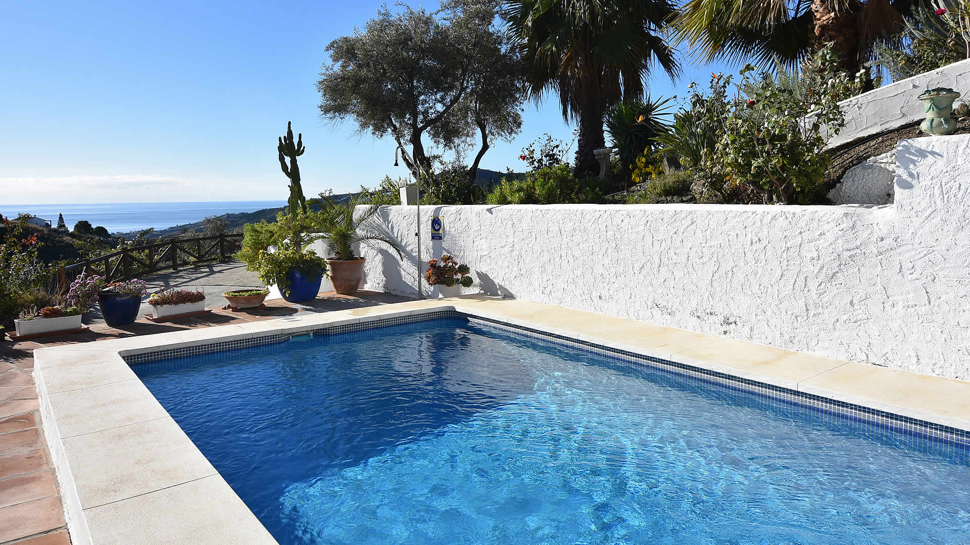 La villa ofrece buena privacidad y esta situado en un sitio hermoso rodeado por olivos y almendros. La amplia terraza delante la casa está orientada al sur y dispone de una atractiva piscina privada (8m x 3m), mobiliario de jardín, hamacas y barbacoa. Se disfruta de una magníficas vistas sobre el campo alrededor con el Mediterraneo al fondo. En el pueblo de Frigiliana (3,5 kms) encontrará tiendas, bares y restaurantes mientras la playas de Nerja están a unos 10 kms. Por la zona se hace senderismos con varios caminos que se pueden acceder directamente desde la casa.
