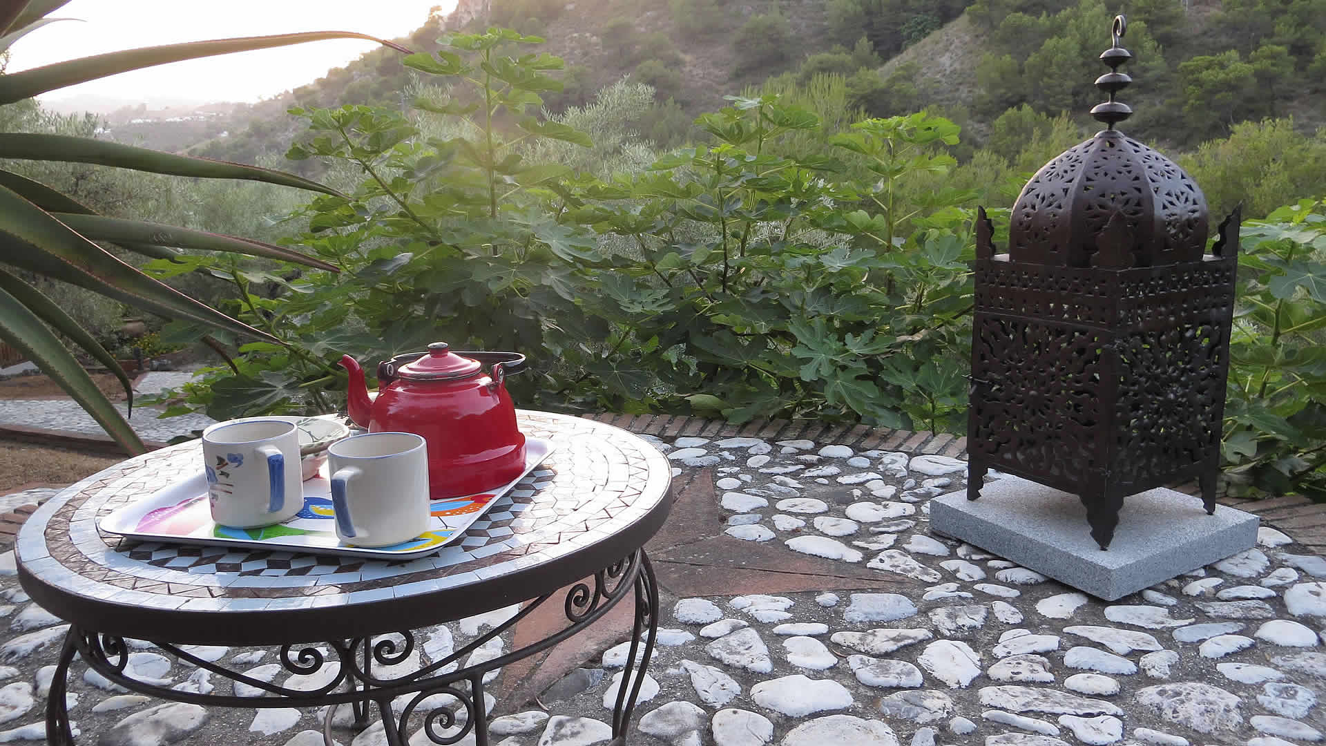 Toen Damian, de eigenaar van het huis, ons benaderde met de vraag of we zijn "cottage" wilden promoten, vertelde hij ons in eerste instantie niets over de naam. In plaats daarvan stuurde hij ons een aantal foto's die ons wel aanspraken en we besloten in de herfst van 2009 een kijkje te nemen. Damian pikte ons die dag op in het dorp Frigiliana en trakteerde ons op een mooie autorit van 10 minuten door de bergen. Hoewel de weg naar het huis weliswaar enkele scherpe bochten heeft zijn er geen problemen omdat het pad volledig is verhard. Bij aankomst waren we zeer onder de indruk van de uitzonderlijk mooie ligging van dit huis: verborgen in één van de allermooiste dalen die deze streek rijk is en die grenst aan het Nationaalpark Sierra Tejada. Ofschoon het lijkt alsof je hier mijlenver verwijderd bent van de zee liggen de stranden van Nerja maar 20 minuten rijden hiervandaan (9 kilometer). Met het vaste voornemen om respectvol om te gaan met de omringende natuur, zo vertelde Damian, wilden hij en zijn vrouw dat het huis geen inbreuk zou maken op de bestaande leefomgeving. Dat is zeker gelukt: het huis is omringd door dennenbomen, geurende planten en eeuwenoude, ecologisch gecultiveerde olijfbomen. Met het verrukkelijke dal op de achtergrond als decor vonden we een privé zwembad van 9 x 4 meter omringd door een charmant terras met elegant tuinmeubilair. Omgeven door bomen maakt het geheel een zeer mediterrane indruk. Vanaf de zitkamer openen de tuindeuren naar het "groene betegelde terras", een heerlijke plek voor uw ontbijt en diner, ondertussen wegdromend bij de magnifieke uitzichten over het omringende landschap. De kleurige Marokkaanse tafel bij de ingang van het huis bepaalt direct de ontspannen atmosfeer en hier komt de naam van het huis tevoorschijn: desgevraagd vertelt Damian ons het volgende: "Als je in staat bent om het geschenk van de natuur naar waarde te schatten en ze als momenten van geluk kunt ervaren, dan heb je de "Kleuren in de Wind" gezien"