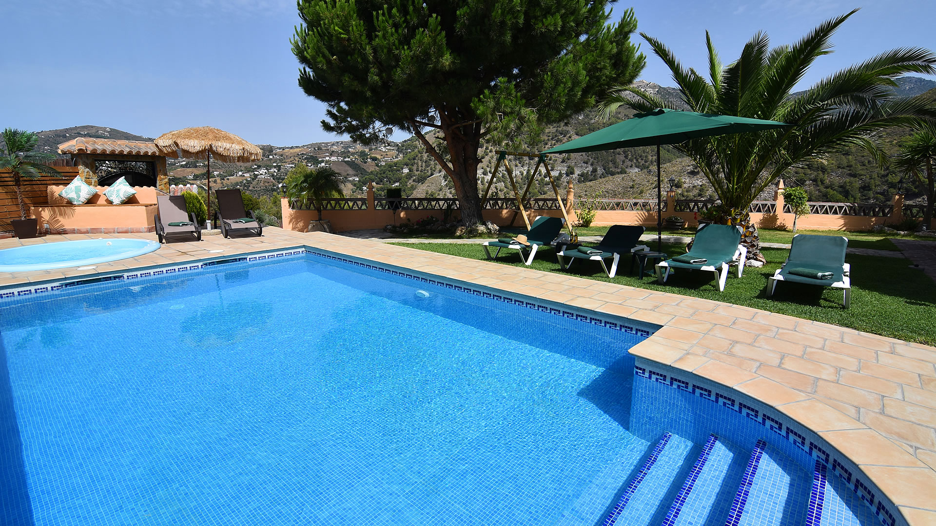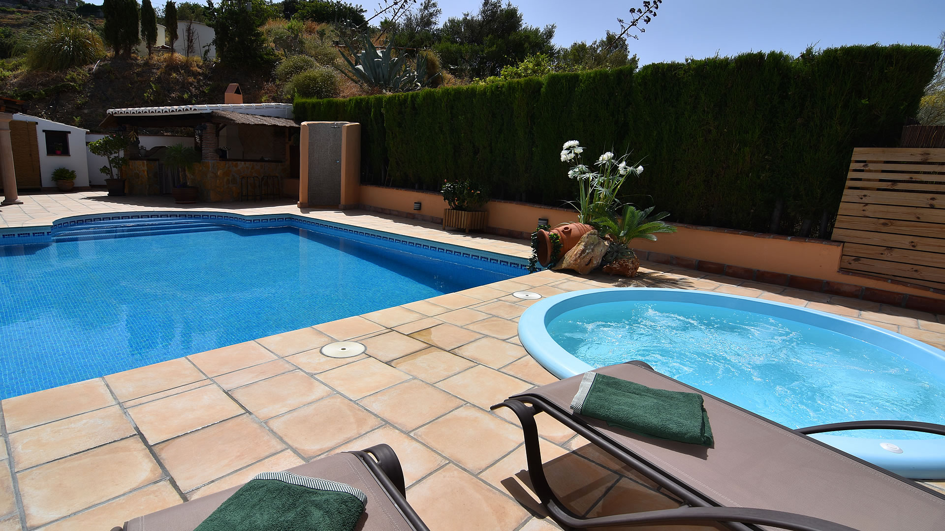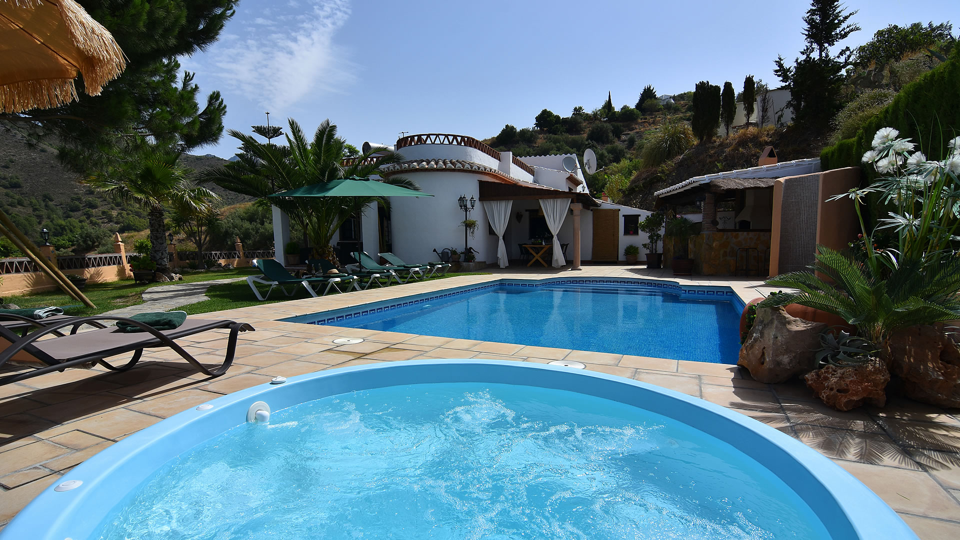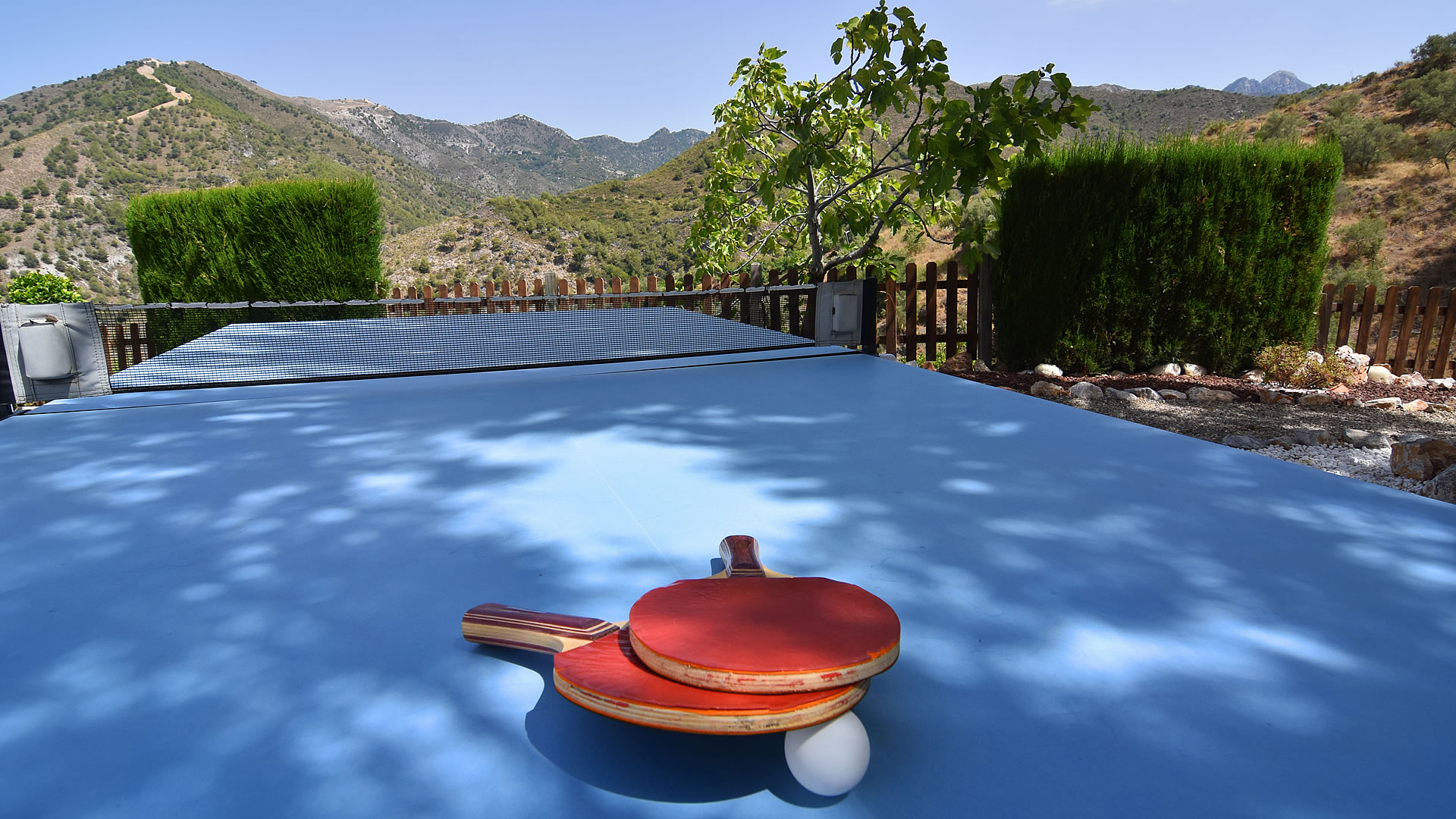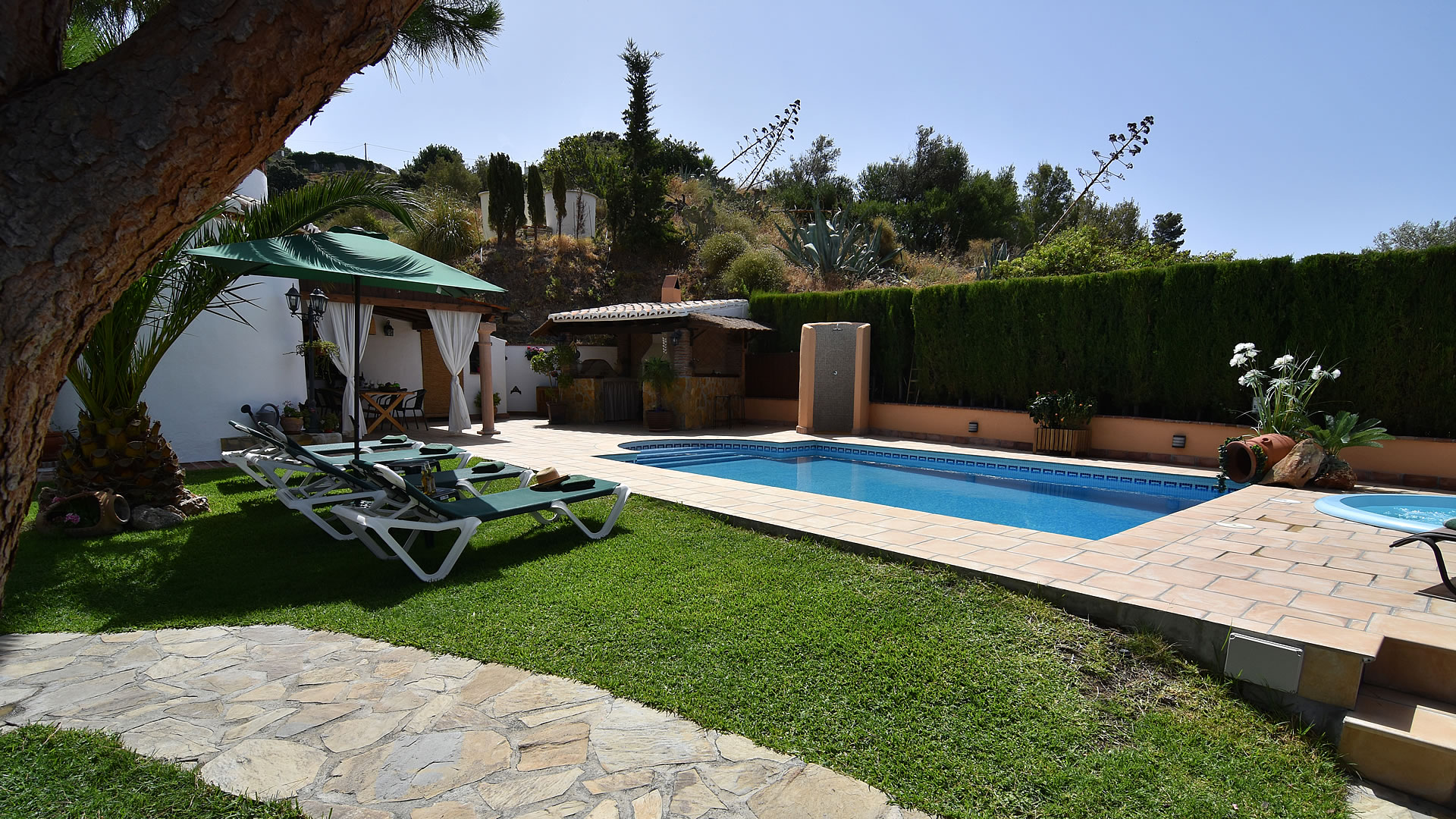 Am Ende einer befestigten LandstraÃe, 5 Kilometer nordwestlich von Frigiliana, liegt dieses prächtige, freistehende Ferienhaus, das alles bietet, was man sich für herrliche Sommerferien nur wünschen kann. Eine ruhige LandstraÃe führt zum Haus hin, welches Sie durch ein privates Tor und über eine Rasenfläche mit Schwimmbecken (7 Meter lang, 4 Meter breit; 1,20 Meter tief) erreichen. Rechts befindet sich eine schattige AuÃenküche mit Spülstein, Kühlschrank, Grill, Arbeitsflächen, Hockern etc. - der perfekte Ort um drauÃen zu speisen! Links vom Haus und etwas zurückversetzt an der Rückseite erwartet Sie eine Pergola mit Sonnenterrasse und Tischtennisplatte sowie noch mehr Garten. Hoch auf einem Hügel gelegen, genieÃen Sie vom Haus aus die beeindruckende Aussicht bis hin nach Competa, Torrox und die umliegende andalusische Landschaft. Das Domizil ist übrigens zugleich ein günstiger Ausgangspunkt, um Andalusien zu entdecken: hierzu bieten sich z.B. die nahgelegenen WeiÃen Dörfer oder die Malaga-SüÃweinroute an! Sie möchten lieber zuhause bleiben? Entspannen Sie dann doch mit einem Glas Sangria in einer der AuÃen-Sitzgelegenheiten. Oder wie wären herrlich-ruhige Stunden mit einem Buch in einem der komfortablen Liegestühle am Rande des Schwimmbeckens? Lust auf eine kleine Abwechslung? Die Umgebung ist ein Paradies für Wanderer; besonders ans Herz gelegt sei Ihnen eine 30 - 40 minütige Wanderung zur Siedlung Acebuchal, einem Dörfchen mit interessanter Geschichte. Sie bevorzugen einen Tag am Mittelmeer? Nach nur 15 - 20 Autominuten stehen Ihnen verschiedene wunderbare Strände Nerjas zur Auswahl! Das Ferienhaus verfügt über zwei Privatparkplätze. Der zum Haus hinführende Weg, über die LandstraÃe, ist ein bisschen schmal, aber keinesfalls gefährlich.