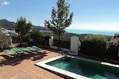 Dit mooie, in landhuisstijl gebouwde vakantiehuis kijkt uit over de vredige en landelijke omgeving van Frigiliana; de ideale omgeving voor een ontspannende onderbreking van de dagelijkse beslommeringen. Buiten wordt het geheel omsloten privé zwembad met afmetingen van 5.4 x 3.8 meter en 1.15 x 160 m diep, omgeven door een groot zonneterras met fantastisch uitzicht op de omringende bergen. Naast het huis is het schaduwrijke gedeelte met patiomeubilair en ingebouwde barbecue een perfecte plek om buiten te eten. Vergeleken bij de andere villaâs in de buurt is deze accommodatie makkelijk bereikbaar via een verhard pad, 1,5 kilometer vanaf Frigiliana. De restaurants in het dorp bereikt u te voet in 20-25 minuten, maar bar/restaurant El Cerro, 300 meter vanaf het huis en slechts 5 minuten lopen, is ook een aanrader. Het vakantiehuis beschikt over een eigen parkeerplaats voor twee autoâs, beveiligd door op afstand bedienbare hekken.