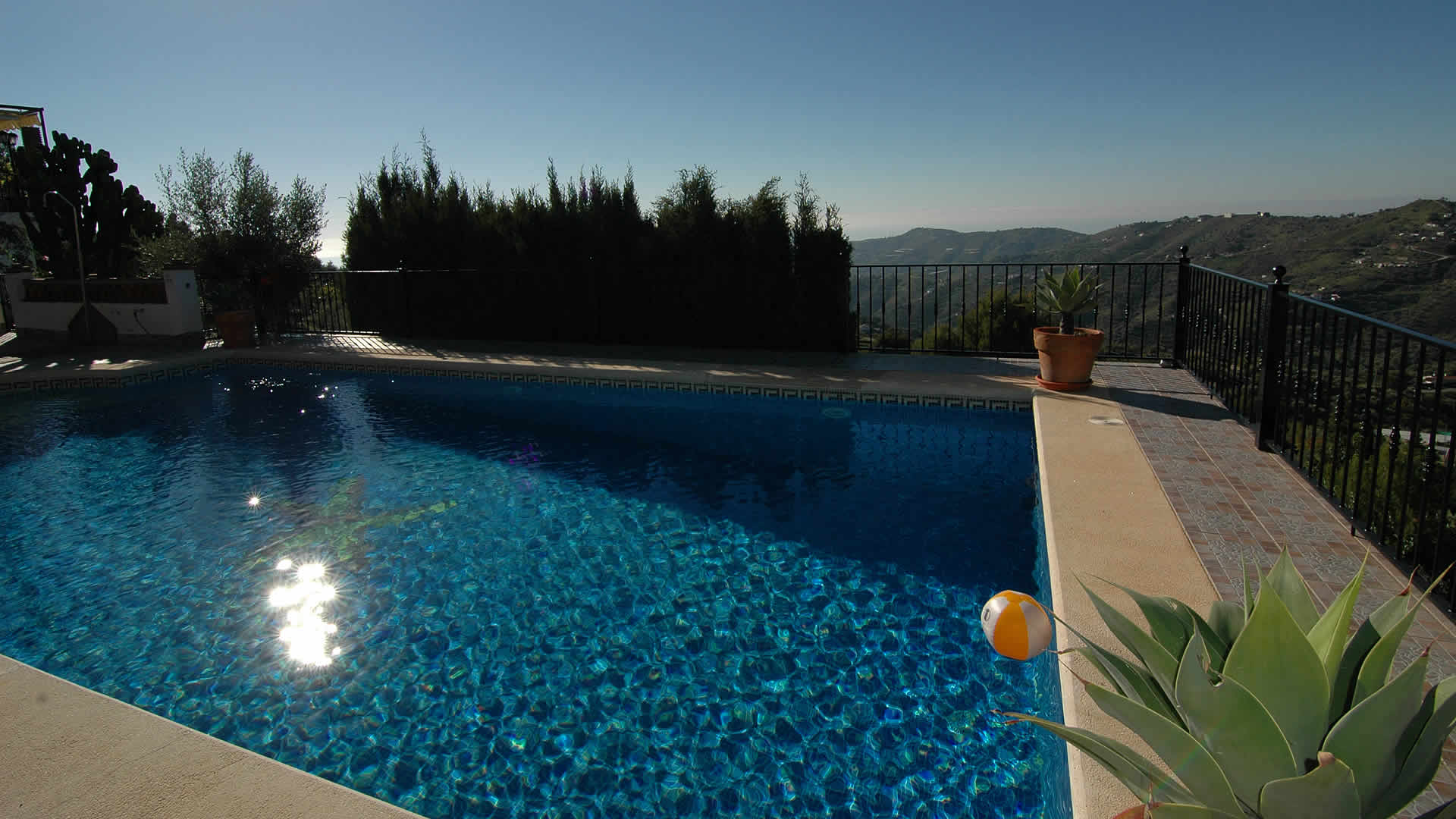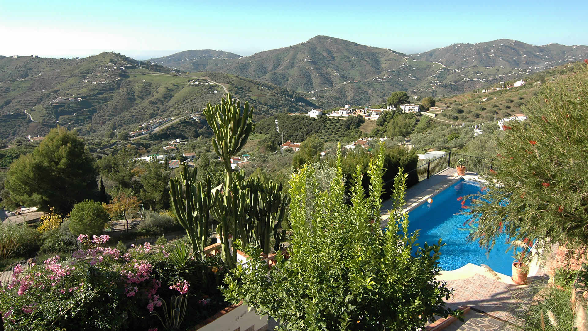 A esta bonita villa independiente se llega a través de un camino de montaña hormigonado, pero se encuentra a menos de 10 minutos en coche de Frigiliana (4 km) y sólo a 20 minutos de la costa de Nerja y sus playas arenosas (11 km). A la llegada, sus ojos directamente captarán las magnÃficas vistas sobre el paisaje de los alrededores hasta el Mediterráneo. Hay varias terrazas espaciosas y zonas de estar, mientras que la piscina está rodeada por un jardÃn lleno de flores, plantas, arbustos y árboles. La piscina privada con escalones romanos está situada en una zona vallada para asegurar la seguridad para niños, y es de buenas dimensiones (10m x 5m y de 1m a 2,5m de profundidad). La zona de barbacoa se acompaña con muebles de jardÃn y es el lugar ideal para entretener a sus invitados una tarde noche mientras disfrutan de una fresca sangrÃa bajo el cielo estrellado. Una ducha exterior de piscina está convenientemente situada en dicha terraza.