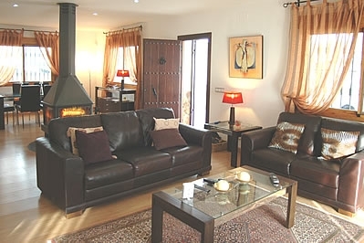 La villa dispone de 2 plantas, cada una de aprox. 100m2, y ofrece excelentes calidades, con suelo radiante de roble, habitaciones espaciosas y mobiliario muy confortable. En el centro del salón hay una preciosa estufa de leña que aporta calidez al conjunto, que tiene un diseño bastante moderno pero cálido. Hay 2 sofás, TV por satélite, DVD y equipo de música con radio y CD. La cocina está bien equipada con una placa de gas con 5 fuegos, horno, microondas, frigorÃfico/congelador y lavadora. También hay un aseo en esta planta. En la primera planta hay un dormitorio con cama de matrimonio y baño ensuite con ducha y calidades de lujo. El segundo dormitorio tiene también cama de matrimonio; el tercero, 2 camas individuales. El segundo baño es amplio y completo. Notas:- La casa tiene su propio sistema solar para generar electricidad, que funciona perfectamente, también en dÃas nublados. Aún asÃ, hay un generador (casi sin usar), por si en algún momento no hubiera suficiente energÃa.