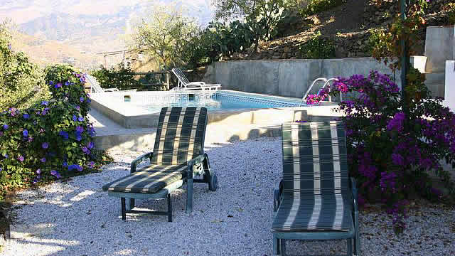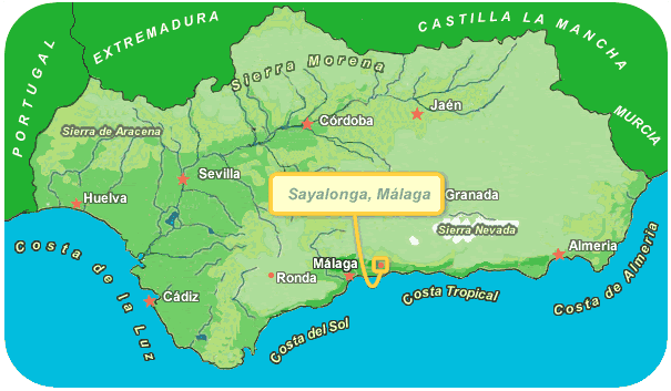 The villa is located in the countryside between Sayalonga (3 km) and Cómpeta (6 km) and to be reached by an unsurfaced country track that leads through the Andalucian hills and mountains, covered with olive groves and avocado trees. Once you arrive here you will be rewarded with fantastic views and a quiet, relaxing stay. The nearby villages of Sayalonga and Cómpeta, are part of the route of the white villages (pueblos blancos). But there are also many other interesting places to visit within easy driving distance, for example Nerja (28 km), with its splendid beaches and famous caves.
