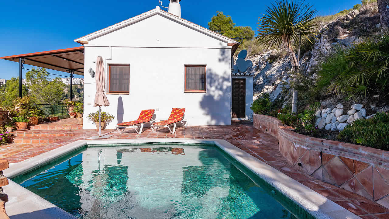 Door de prachtige ligging van deze accommodatie, ten noorden van Nerja, in het gebied van het Nationaal Park in de Sierra Tejada bent u totaal omringd door natuur. U vindt hier eekhoorns, vossen, konijnen, berggeiten, wildzwijnen, patrijzen, adelaars en andere wilde dieren! Het huis is bereikbaar via een nogal steil, verhard pad, en eenmaal boven geniet u van verbluffend mooie vergezichten over het omliggende landschap tot aan de kust. Aan de voorkant van het huis bevindt zich een overdekte veranda, een schaduwrijke plek om een heerlijke siësta te houden. Aangrenzend aan het huis vindt u het onregelmatig gevormde privé zwembad van 4 x 3 meter met zonneterras. .N.B.: Het huis is letterlijk en figuurlijk een "verheven" plek. De eigenaar laat u bij aankomst de weg van Nerja naar het huis zien, die ongeveer 12 minuten in beslag neemt. Voor de avontuurlijken onder ons is er een snellere, alternatieve route vanaf de hoofdweg Nerja-Frigiliana. U bent dan met de auto in ca. 5 minuten bij het huis, maar deze weg kan alleen worden gebruikt in het droge seizoen omdat deze over de rivierbedding leidt. Voor deze alternatieve weg zijn goede chauffeurskwaliteiten vereist omdat de weg steil is en haardspeldbochten heeft.