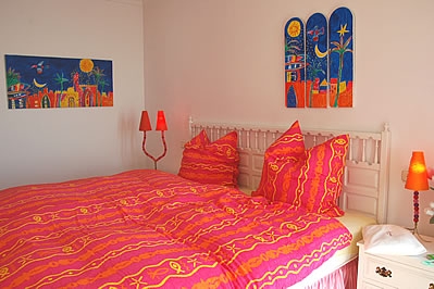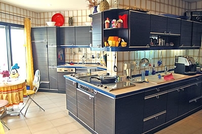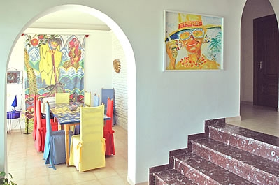 Por dentro es muy espacioso y luminoso con una decoración con mucho color que resulta un poco extravagante. El salón impresiona por su alto techo con varios arcos formando una cúpula que refuerza la sensación de amplitud. Hay una chimenea, televisión de 42 pulgadas con recepción a través de satélite, equipo de música con CD y un rincón con una barra, estupendo para entretenerse con los amigos. La cocina es de lujo, muy amplia y dispone de vitro-cerámica, horno, microondas, lavavajillas y algunos artilugios especiales como una maquina expreso. Junto a la cocina encontrará el comedor con sillas en varios colores. Los tres dormitorios están situados en la primera planta y decorados con el mismo toque de color y extravagancia. Hay 2 baños (uno de ellos ensuite) y un aseo. La lavadora se encuentra en un cuarto independiente.Nota: La casa dispone de aire acondicionado en los dormitorios (gratuito).