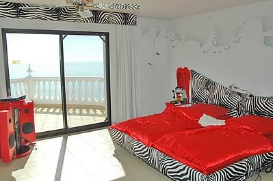 Esta villa tiene una situación excelente, en la urbanización Chimenea, con vistas frontales al Mediterráneo y a la playa Burriana. En el exterior encontrará un jardÃn maduro con césped y una gran piscina de 5 por 15 metros. El diseño del interior es algo extravagante, con mucho color. ¡Seguro que a los niños les encantará el guiño hacia los favoritos de Disney!