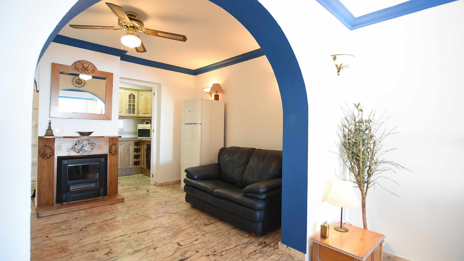 La casa está construida en dos plantas, con suelos de mármol y amueblada acogedoramente y con buen gusto En la planta baja tenemos una luminosa sala de estar con una gran televisión plana, una esquina comedor y una chimenea. La cocina es pequeña aunque elegantemente amueblada y está equipada con vitrocerámica, horno, microondas, lavavajillas y frigorÃfico/congelador. La lavadora está emplazada en un cuarto lavadero, bajo las escaleras. Hay también un cuarto de aseo (WC y lavabo) en esta planta.En la primera planta encontrará un espacioso dormitorio de matrimonio con una amplia terraza privada. El segundo dormitorio es doble con dos camas individuales. El tercer dormitorio de esta planta es muy pequeño y está compuesto por un cama litera y no tiene armario. Por este motivo pensamos que es solo adecuado para dos niños. También encontraremos un cuarto de baño completo con baño-ducha, WC, bidé y lavabo. La casa tiene aire acondicionado en el salón y en 2 dormitorios. Dispone de conexión a Internet wifi (gratuita).