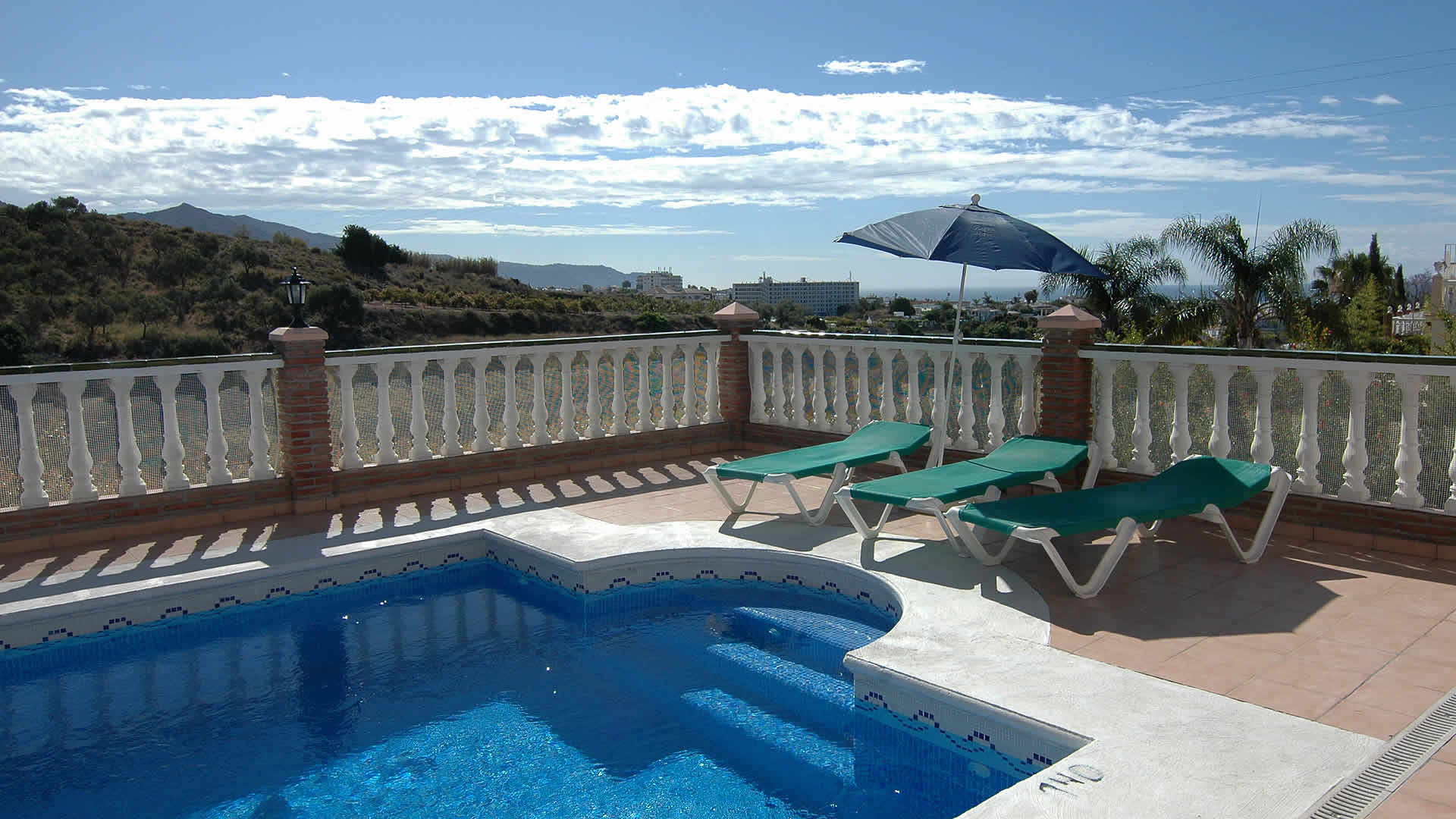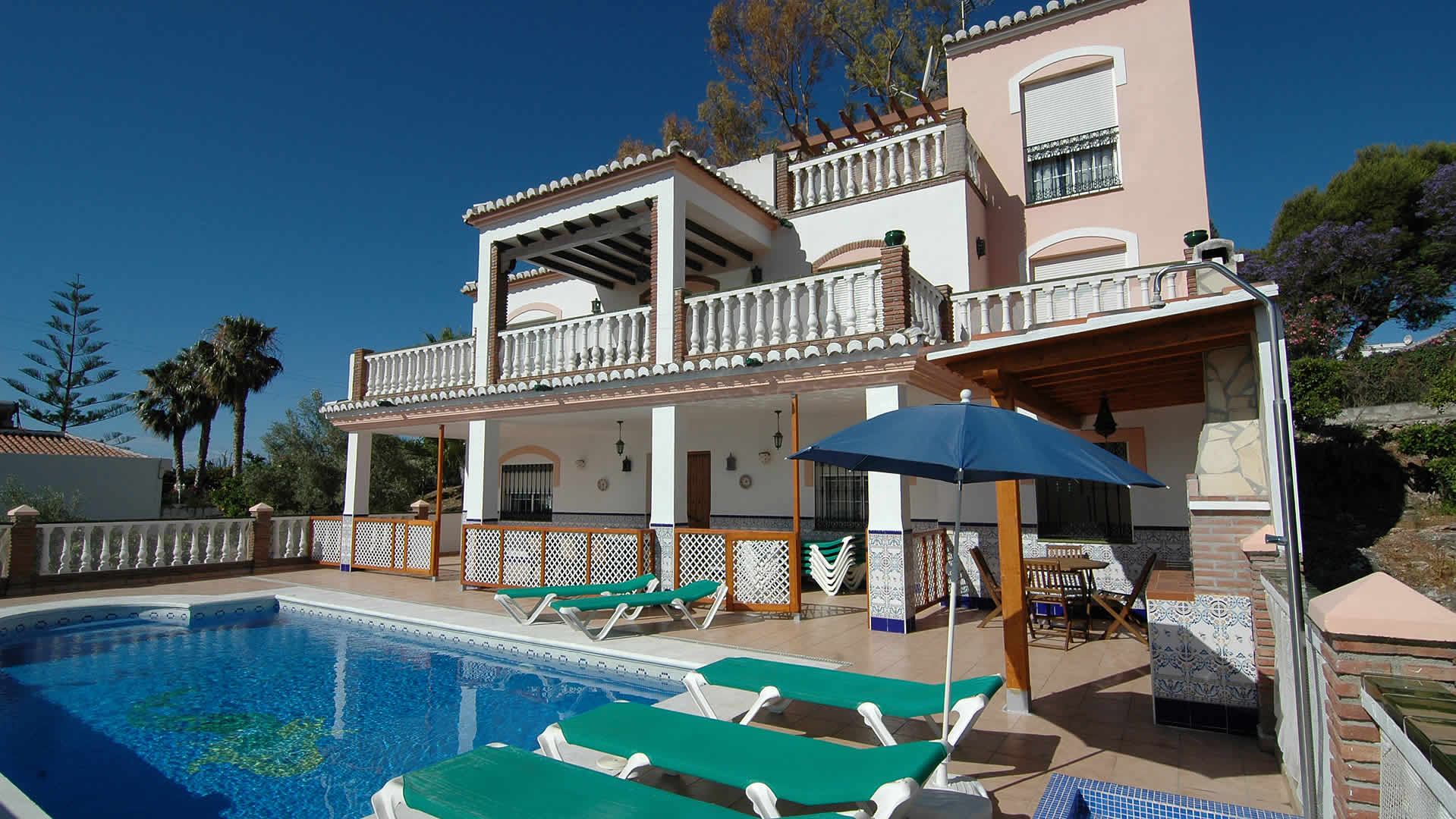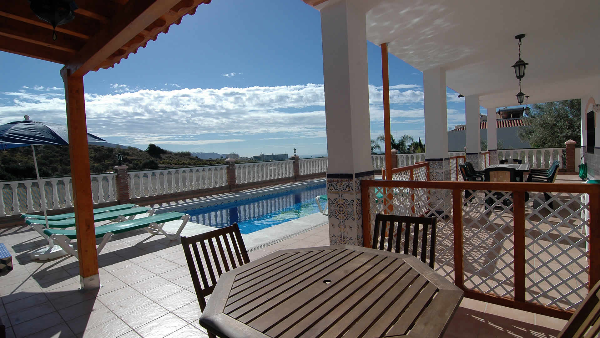 Wenn Sie auf der Suche sind nach einem Ferienhaus, das sich in Strand-, und zugleich Stadtnähe befindet, dann könnte dies hier vielleicht das passende Angebot sein: dieses komfortable Ferienhaus liegt im Viertel Exotica, 5 Autominuten vom Zentrum von Nerja und auch vom Strand entfernt. Es handelt sich um ein gut ausgestattetes und geräumiges Domizil, eine ausgezeichnete Möglichkeit für gröÃere Familien oder einen Freundeskreis. Von der herrlichen, überdachten Terrasse auf der ersten Etage blicken Sie auf das Schwimmbecken, und es entfaltet sich vor Ihren Augen ein weiter Ausblick über die Landschaft der Umgebung und die Berge bis hin zur Küste.