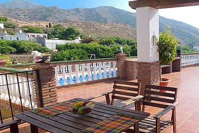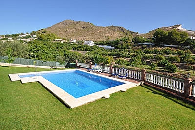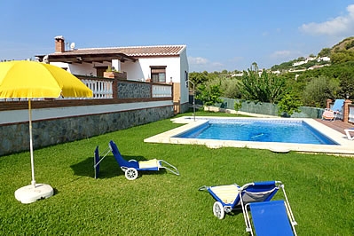 Situada a tan sólo 3 kms al norte de Nerja, en las montañas donde reinan la paz y tranquilidad. La zona exterior invita a relajarse con un buen libro o a tomar el sol en sus jardÃn con césped, amplia terraza, muy completa con barbacoa, hamacas, mesa comedor y sillas. La tentativa piscina privada mide 8 x 5 metros, suficiente para darse un buen chapuzón. Desde aquà es muy fácil emprender una excursión a los pueblos de la AxarquÃa, como por ejemplo Cómpeta, famoso por su miel y dulces vinos. Málaga capital esta a una hora de distancia y vale la pena visitar el museo Picasso para quienes aún no lo han visto. ¡Y no olvide las cuevas de Nerja!