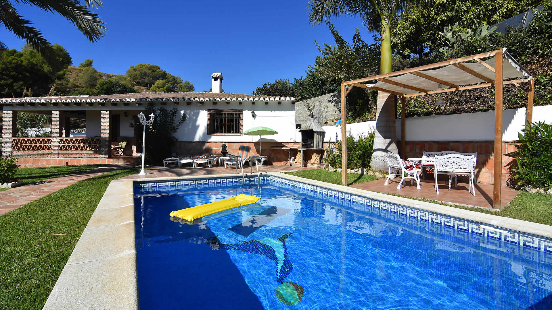 Este atractivo chalet es uno de nuestros favoritos. Tiene un estupendo y amplio jardín con césped y frutales. Una atractiva piscina (7,5m x 3,8m) y suficiente privacidad. Situación excelente en ambiente rural, y cerca de la carretera de Nerja a Frigiliana (3 km). Nerja y sus playas se encuentran a 3,5 km. La barbacoa y el bonito porche son una buena opción para los amantes de la parilla. Camino sin asfaltar de 700m.
