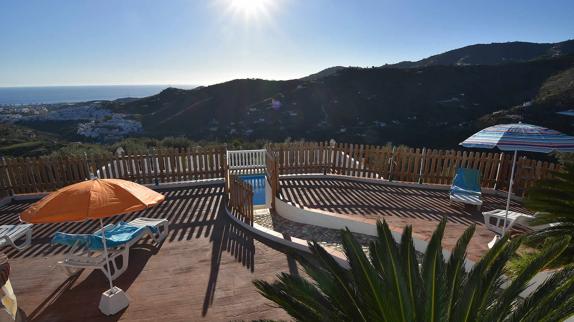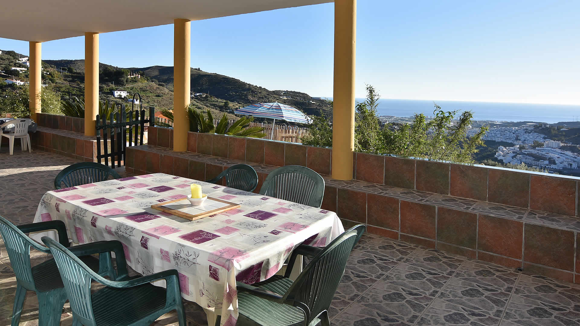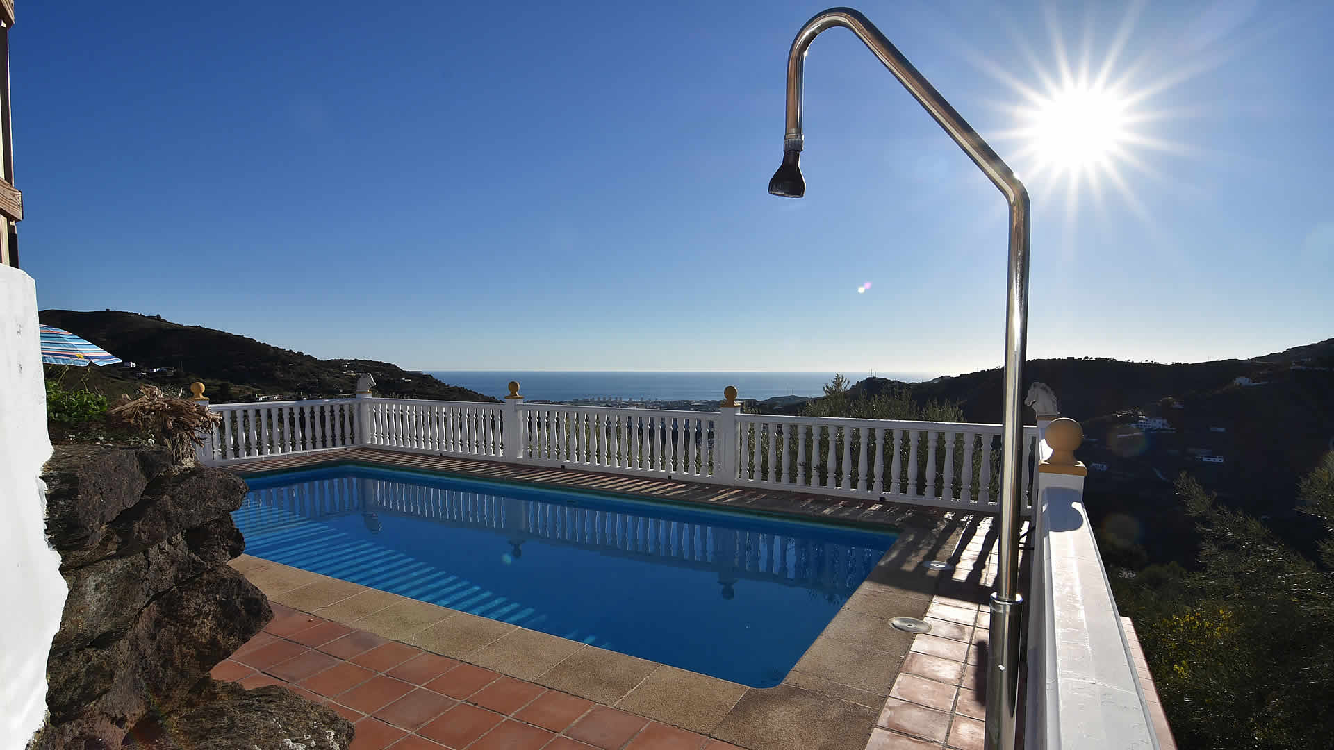 The property is set in an elevated position, with unbeatable views on the terraced landscape out to the sea. The adorable village of Torrox is a 10 minute drive away. The villa is just 20 minutes from the coast and perfectly placed to explore the Nerja caves, Granada or Málaga. The spacious verandah comes with two dining tables for a total of 10 persons and stairs that lead down to the attractive pool area (9 by 5 meters) with a shower to cool off in between swims. On the backside of the property is suficient parking space for 5 cars.
