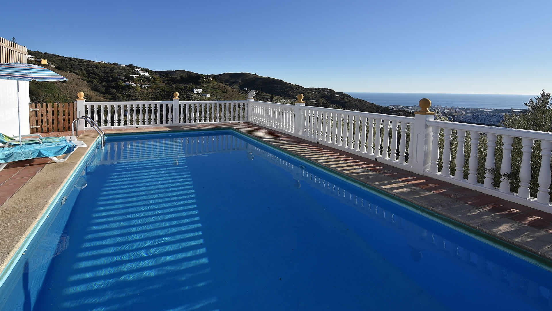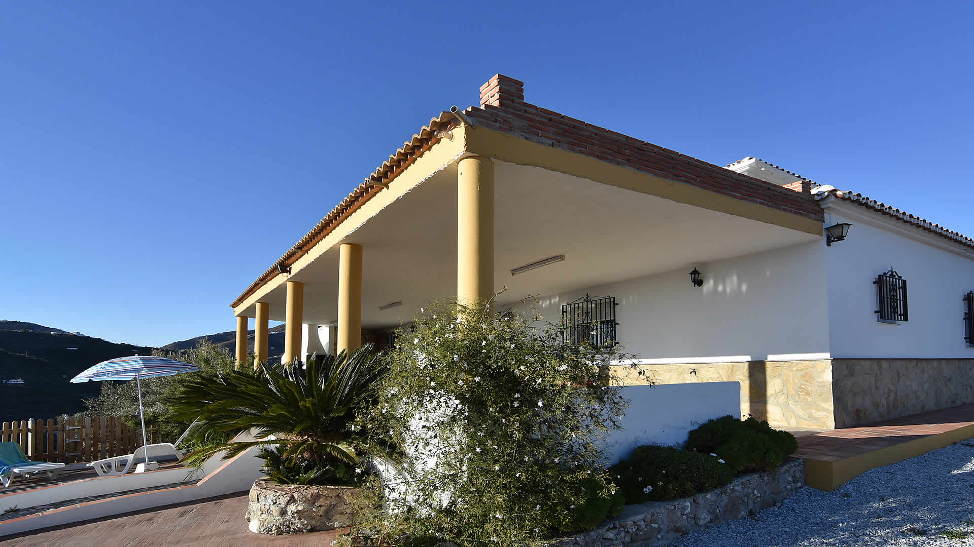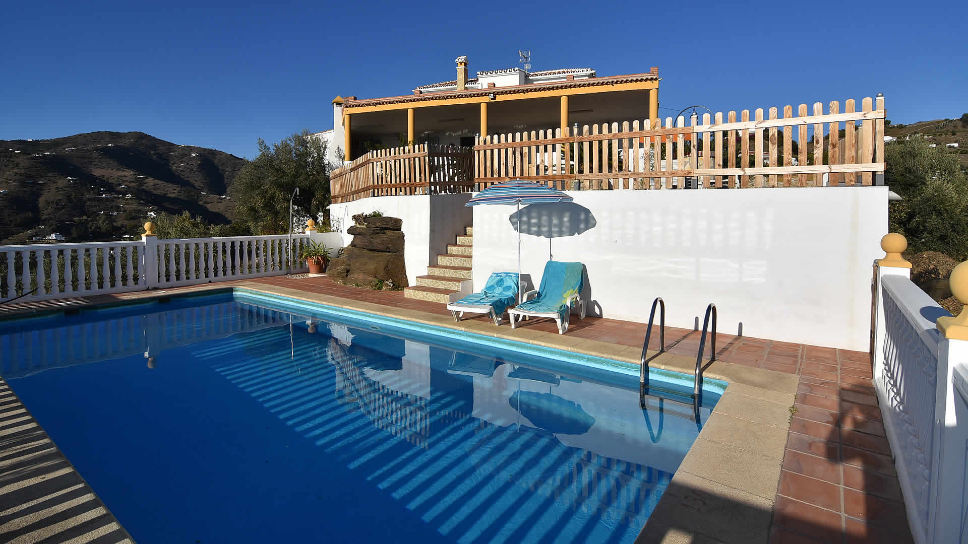 The property is set in an elevated position, with unbeatable views on the terraced landscape out to the sea. The adorable village of Torrox is a 10 minute drive away. The villa is just 20 minutes from the coast and perfectly placed to explore the Nerja caves, Granada or Málaga. The spacious verandah comes with two dining tables for a total of 10 persons and stairs that lead down to the attractive pool area (9 by 5 meters) with a shower to cool off in between swims. On the backside of the property is suficient parking space for 5 cars.