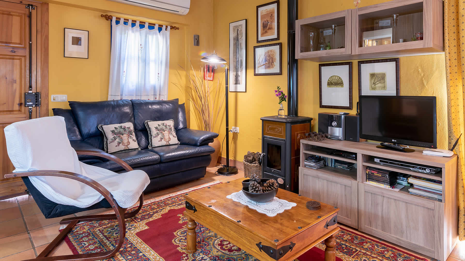 El comedor, con una mesa y 4 sillas, tiene vistas al patio de entrada. En la sala de estar hay un confortable sofá, un práctico y cómodo sillón, una mesa de centro, un aparador con televisión (con canales ingleses a su disposición), DVD y Radio-CD (con una selección de películas y música). También hay una estufa de leña. El soleado dormitorio principal en la planta baja tiene una cama de matrimonio con mesitas de noche, armario y cómoda con cajones. La cama es de especial interés debido a su original cabecero, creado por un artista local que empleó para su fabricación hierro forjado a mano, madera y piedras preciosas. La habitación es muy luminosa gracias a una ventana que da a una zona privada del exterior y donde crece un viejo algarrobo (especie autóctona y protegida de la zona).
