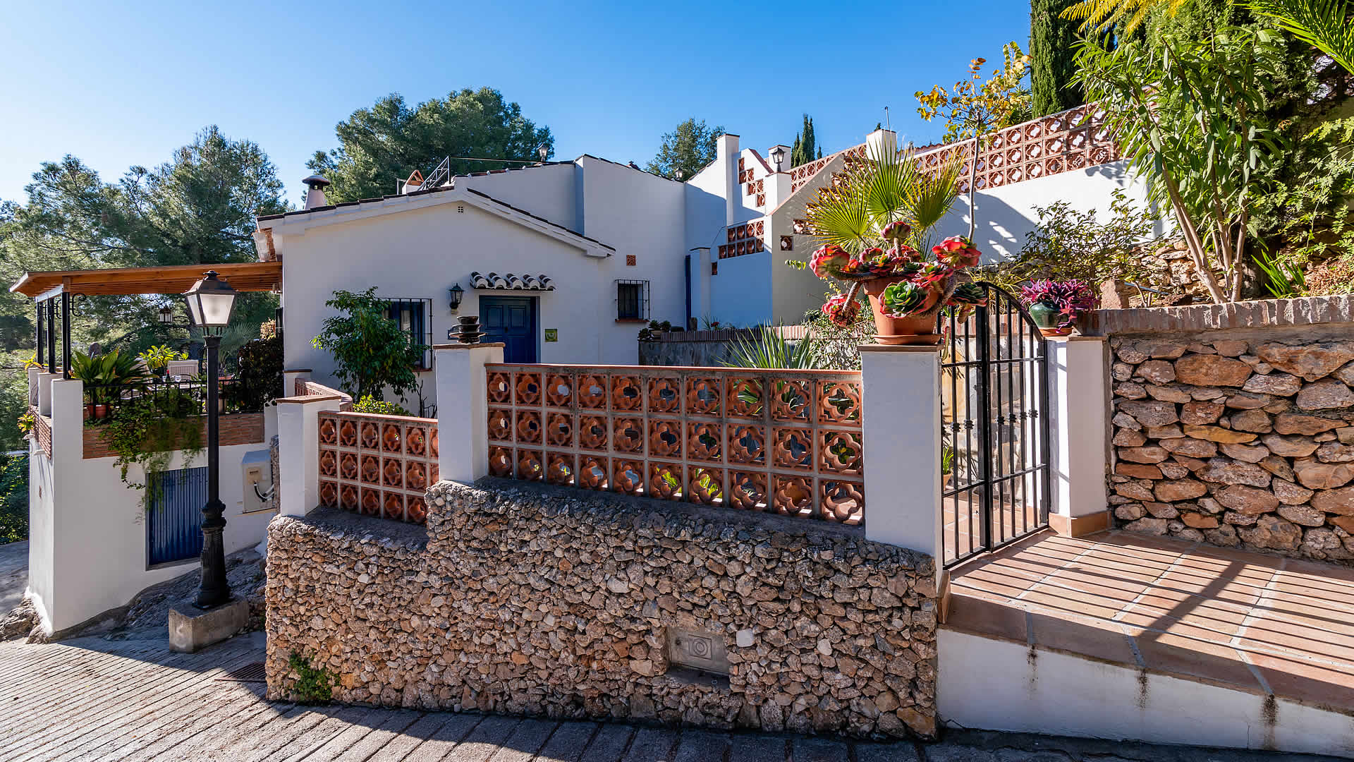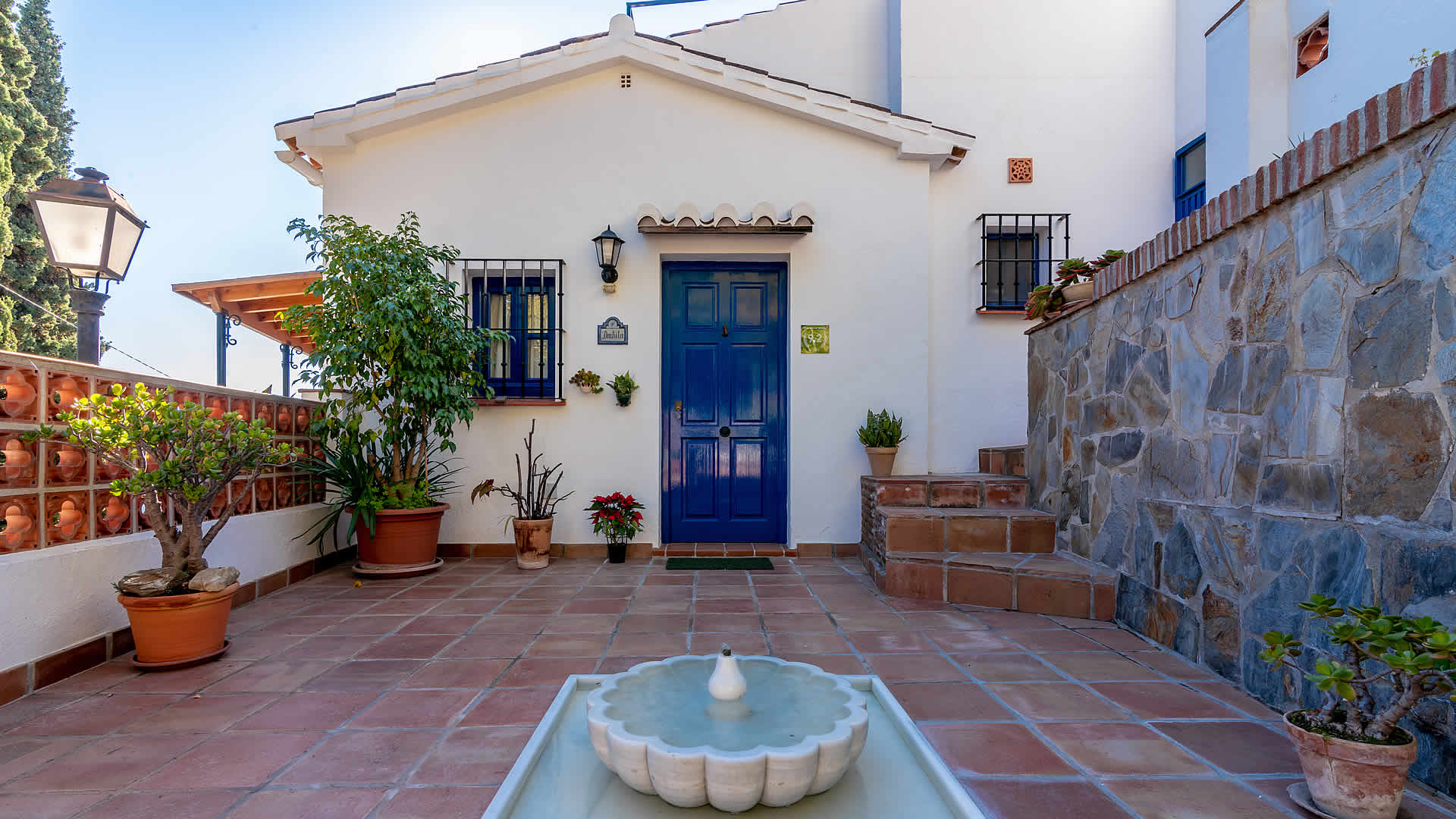 La entrada a la casita se hace por un espacioso y soleado patio construido con ladrillos hechos a mano. Dicha entrada se encuentra llena de macetas y tiene un pequeño jardín a la derecha. La puerta de madera (pintada en azul para que haga juego con los marcos de las ventanas y así dotarla de un aire auténticamente mediterráneo) nos conduce hasta el comedor, la cocina, sala de estar y cuarto de baño. Una gran puerta de cristal lleva a una amplia terraza con mobiliario de jardín y barbacoa. La terraza está cubierta con una pérgola y en ella disfrutará de unas preciosas vistas al mar, la campiña y las montañas. La posición de la terraza es ideal tanto para estancias veraniegas como invernales. La piscina privada (6 x 3m y 1.4 - 1.8m de profundidad) viene equipada con un sistema de purificación por ionización, libre de sustancias químicas y por tanto respetuosa con la piel y el entorno! Al final de la piscina hay un mosaico hecho a mano, elaborado por un artista local. El tema y nombre del mosaico es "Sol". El mobiliario exterior consta de tumbonas, una mesa y una amplia sombrilla.