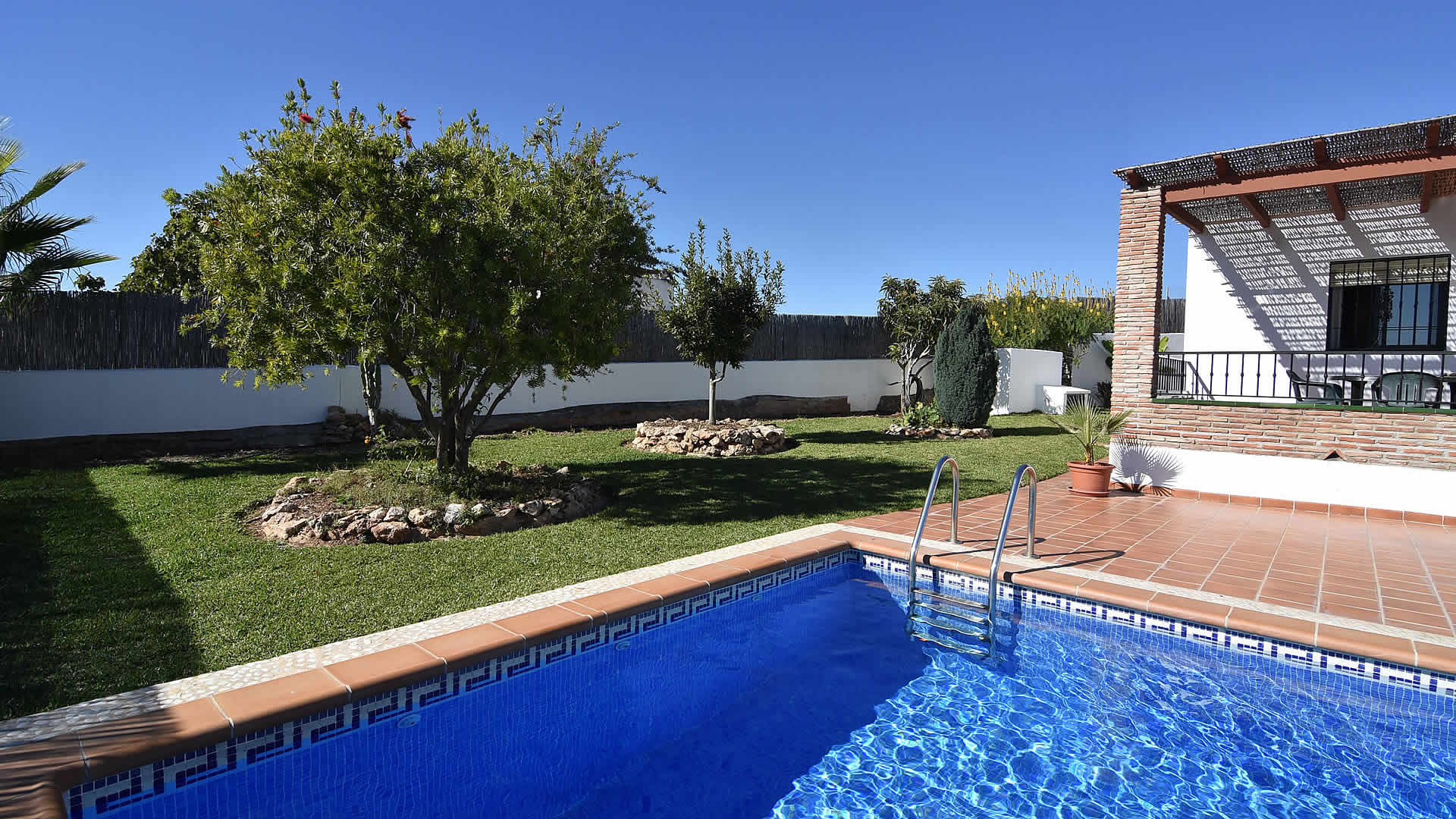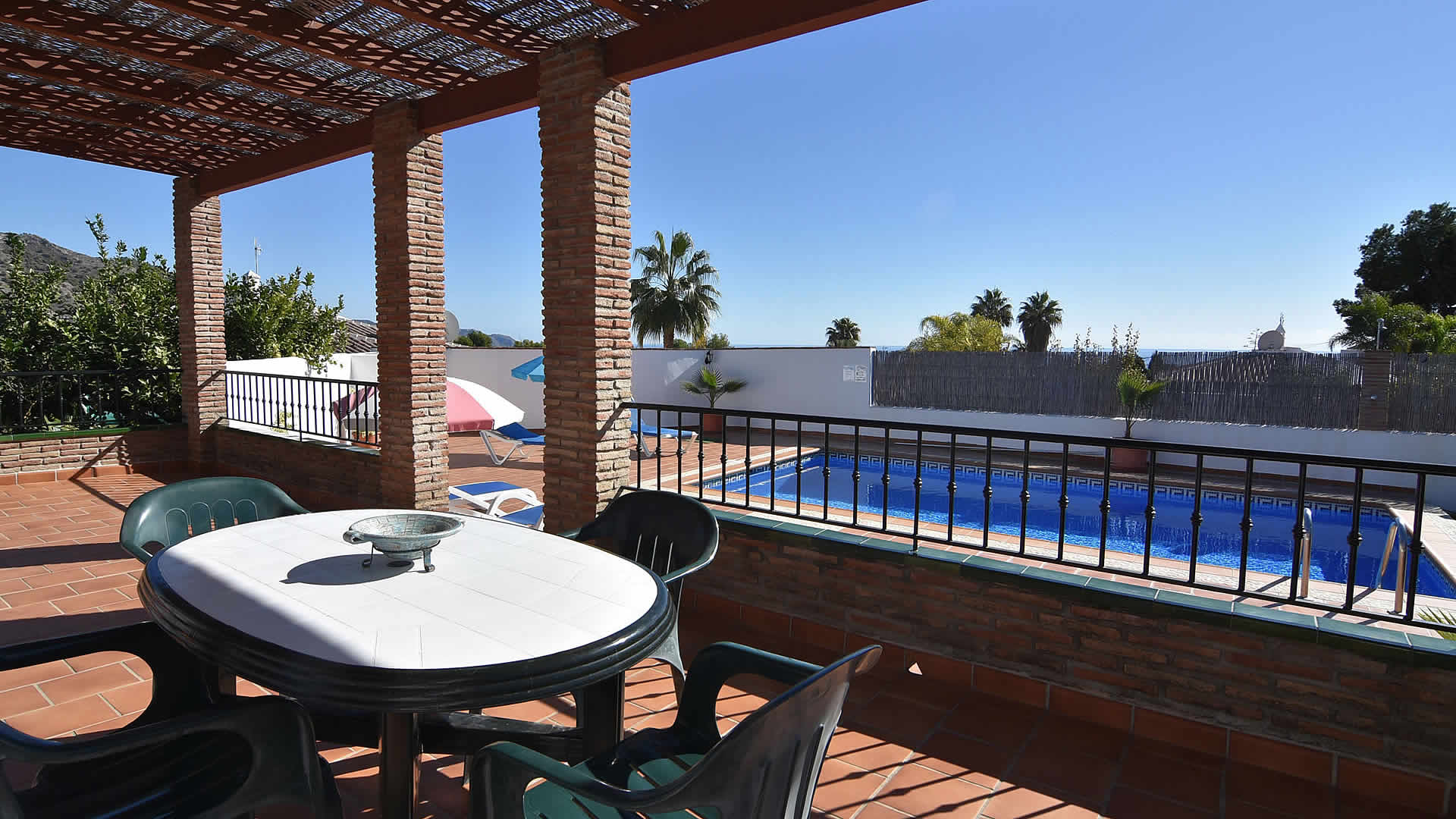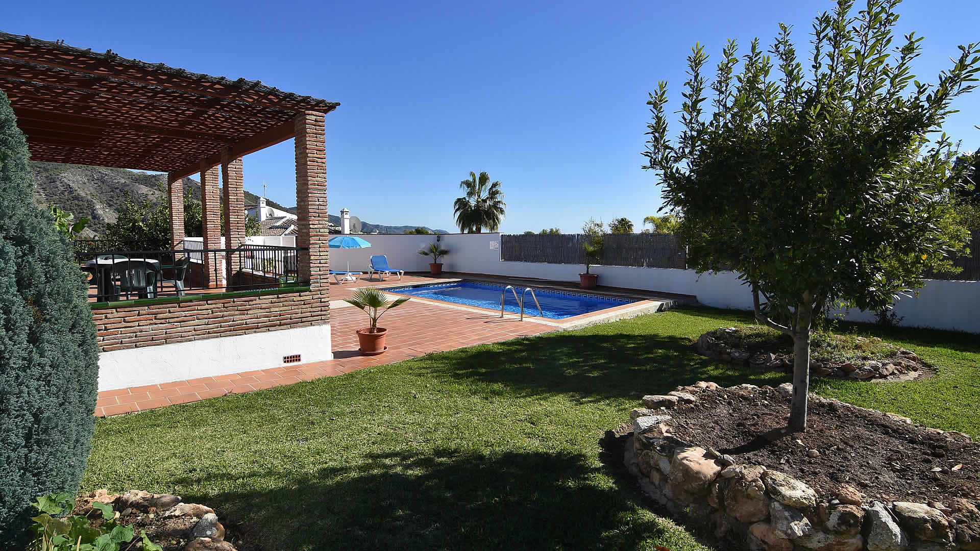 Ãsta es la casa ideal para vivir al aire libre; puede refrescarse en su propia piscina privada (7m x 3m de largo y 1,35m â 1,63m de profundidad), disfrutar de una siesta bajo la sombra del porche o usar la barbacoa para sus cenas al aire libre. ¡Parecerá que los dÃas soleados nunca llegan a su fin! La finca tiene un emplazamiento tranquilo en el campo pero de fácil acceso. Los niños disfrutarán del jardÃn de césped donde pueden jugar sin perderse. Se proporcionan muebles de jardÃn y tumbonas. Si puede alejarse de este relajante lugar, visite los hermosos pueblos de los alrededores o experimente la grandeza del espléndido Palacio de la Alhambra de Granada. Para salir de noche, Nerja ofrece una excelente selección de restaurantes, bares de tapas y locales para ir de fiesta. Nerja es también el lugar donde los amantes de la playa tienen una amplia para escoger, desde la famosa playa de Burriana a las playas más aisladas al este.