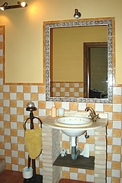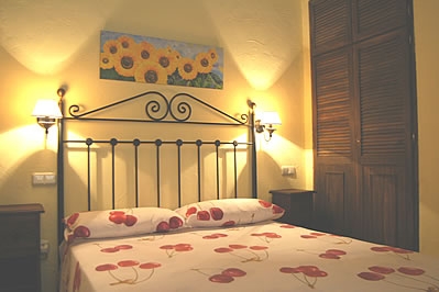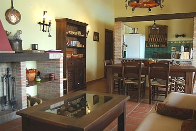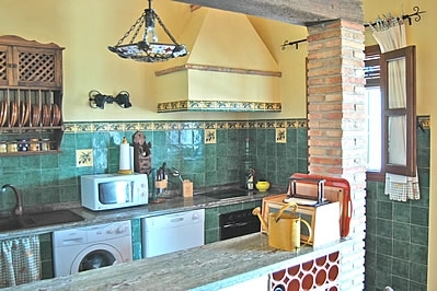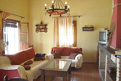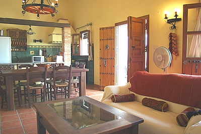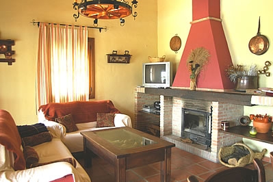 Su interior es muy cómodo y cuidado en estilo rústico, con colores y materiales Andaluces. El salón es muy amplio y cuenta con chimenea, televisión vÃa satélite, dvd y equipo de cd. La cocina está totalmente equipada, dispone de lavadora, lavavajillas, vitrocerámica, horno eléctrico, microondas, nevera y pequeños electrodomésticos. Se completa con una bonita vajilla de barro y demás menaje. Los 3 dormitorios son dobles, dos de ellos cuentan con cama de 1,50 m. y el otro con dos camas individuales. Disponen de armario y calefacción. Los dos baños (uno de ellos con placa de ducha y dentro del dormitorio) son completos y cuentan con secador de pelo. La casa dispone de conección a internet a través de WiFi.